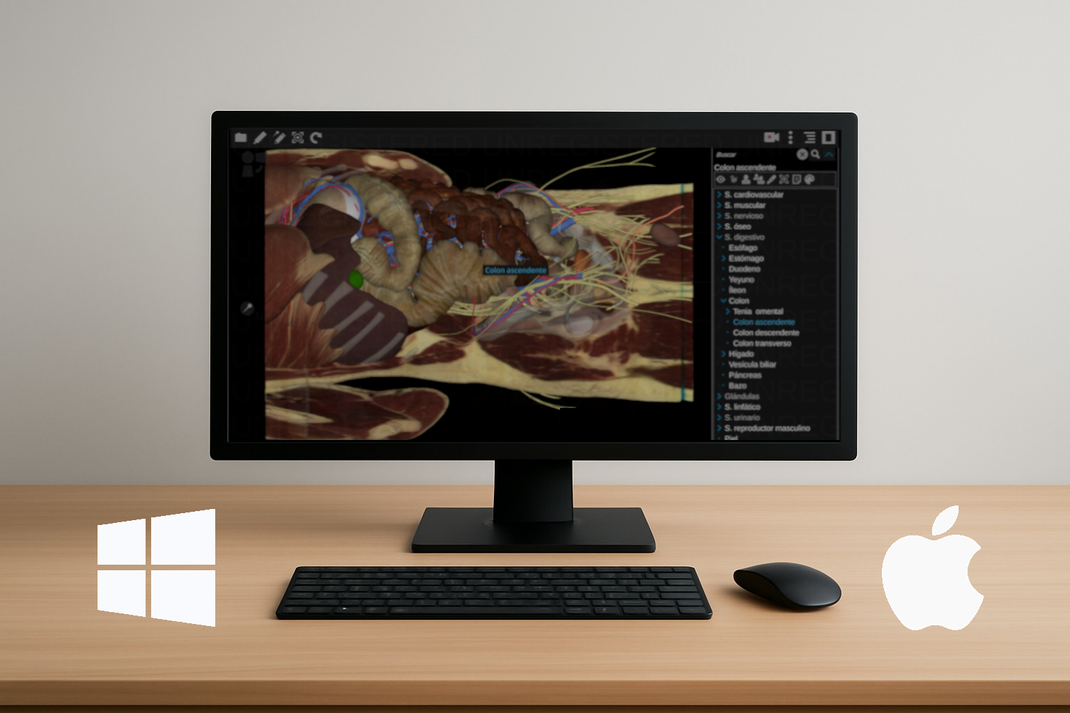Este simulador anatómico en 3d realista y portable incluye los órganos del abdomen, generados por segmentación y los cortes a color correspondientes en los planos transversal (cada 3 mm), sagital (cada 5 mm) y coronal (cada 5 mm) para las plataformas Windows o Mac.