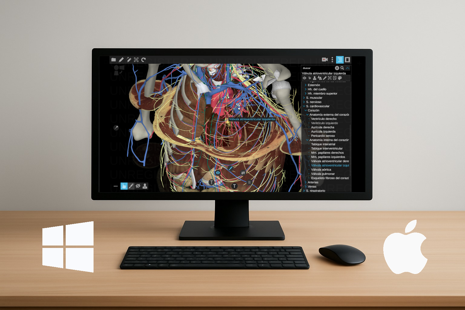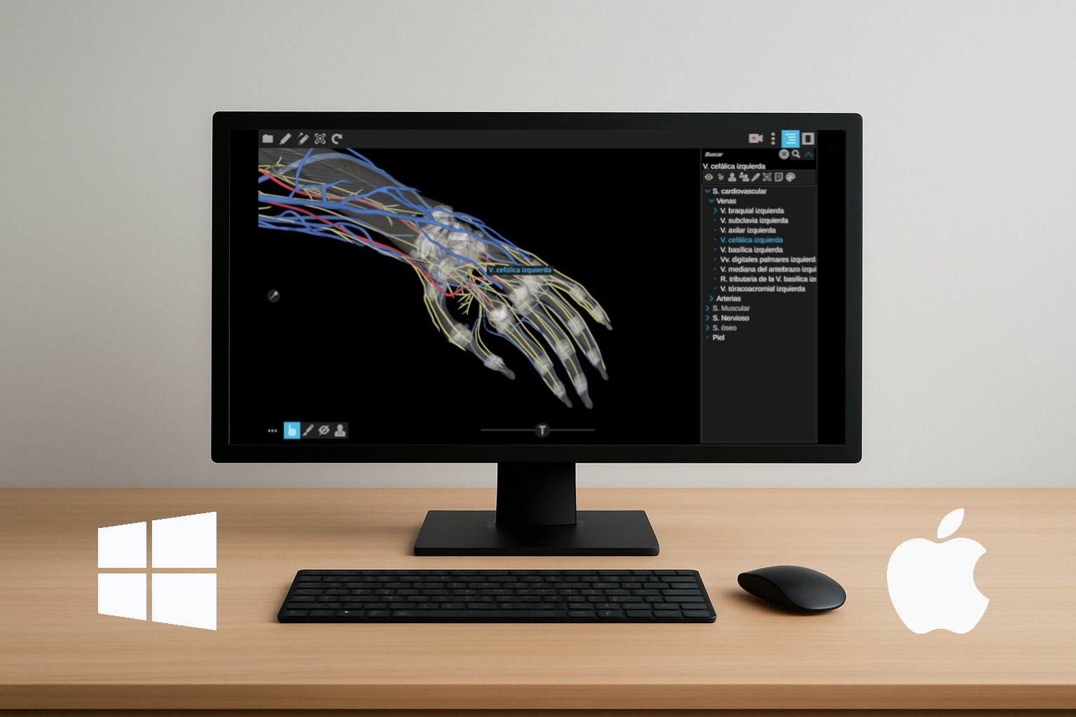 Este simulador anatómico en 3d realista y portable incluye en dos tomos los órganos del miembro superior y miembro inferior, generados por segmentación y los cortes a color correspondientes en los planos transversal (cada 3 mm), sagital (cada 5 mm) y coronal (cada 5 mm) para las plataformas Windows o Mac.