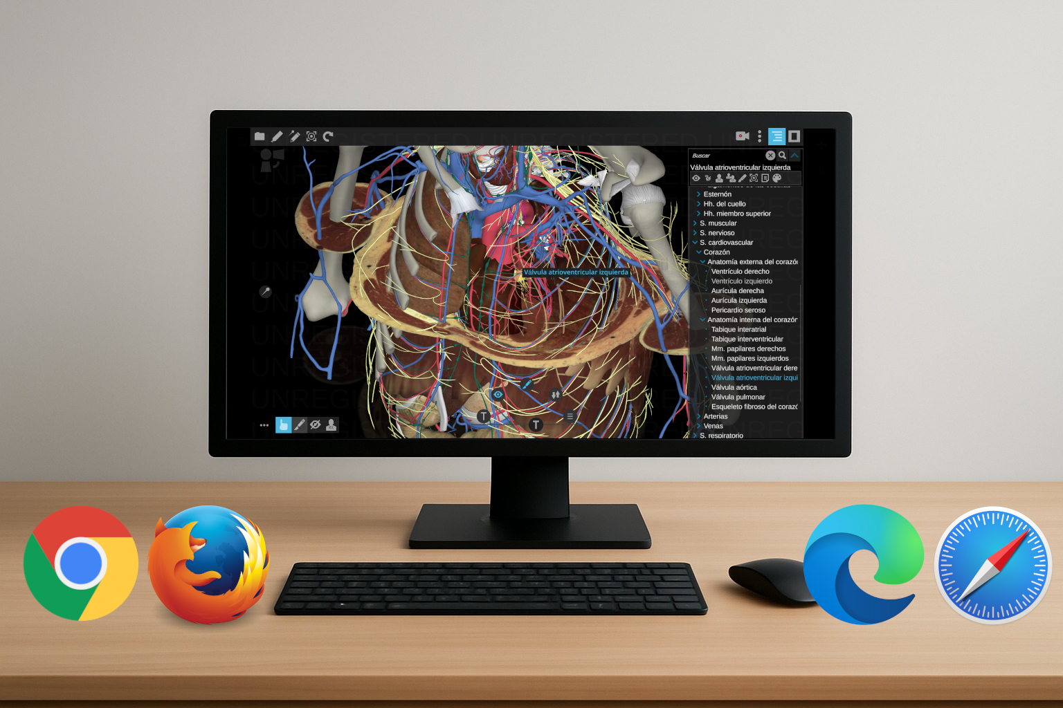 Este simulador anatómico en 3d realista y portable incluye los órganos del tórax, generados por segmentación y los cortes a color correspondientes en los planos transversal (cada 6 mm), sagital (cada 10 mm) y coronal (cada 10 mm) para cualquier navegador actualizado.