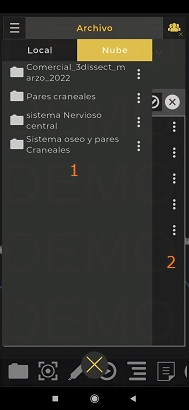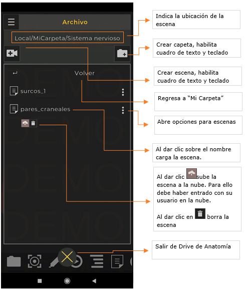 En el Drive de anatomía puede guardar, cargar y compartir las escenas-pines, descripciones y “quices” en su dispositivo o en la nube.
