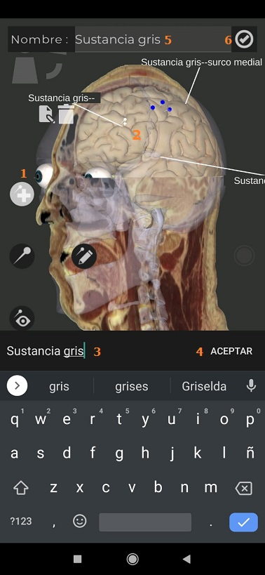 Le permitirá adicionar pines y establecer el nombre de la estructura anatómica a nombrar o incluir un enlace a una página web.
