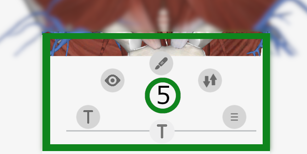 Permite seleccionar el plano de corte activo. Al tocar las letras se presentan los controles de selección de los tres planos de corte, permitiendo tocar para cambiar entre T (transversal) C (coronal) y S (sagital)