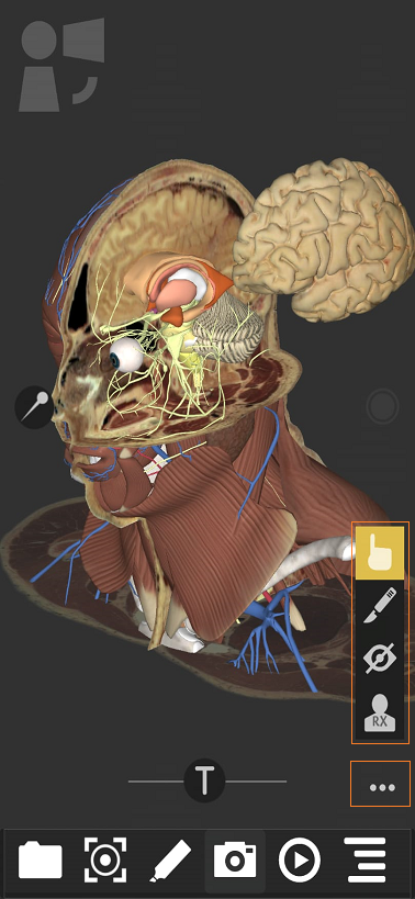 Permite ejecutar la misma acción sobre los órganos 3D sin necesidad de abrir el árbol o el menú flotante. Se accede a través del ícono Active o desactive la acción al dar un toque sobre ícono, diríjase al modelo 3D y toque el órgano 3D que desee cambiar con cualquiera de las siguientes opciones: Mover, cortar, ocultar o dar transparencia. |